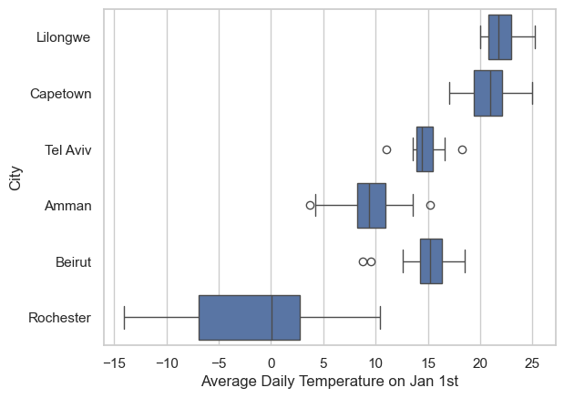 [Text(0.5, 0, 'Average Daily Temperature on Jan 1st')]