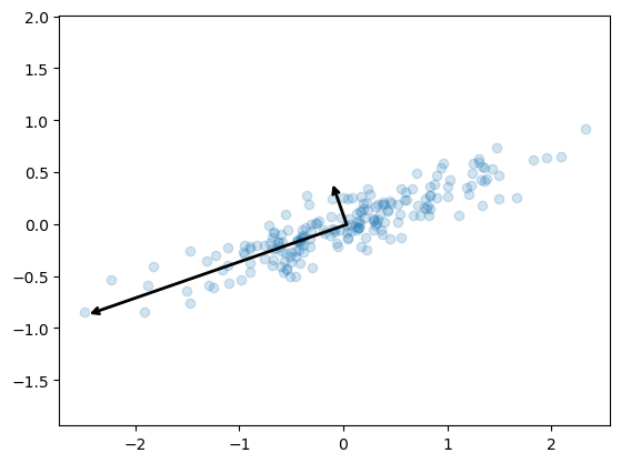 These vectors represent the principal axes of the data, and the length of the vector is an indication of how “important” that axis is in describing the distribution of the data—more precisely, it is a measure of the variance of the data when projected onto that axis. The projection of each data point onto the principal axes are the “principal components” of the data.