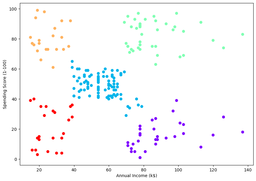 # plt.scatter(data[:,0], data[:,1], c=cluster.labels_, cmap='rainbow')