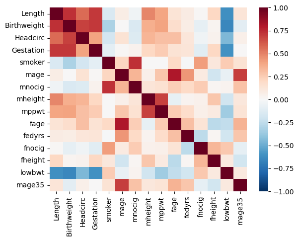 | Length | Birthweight | Headcirc | Gestation | smoker | mage | mnocig | mheight | mppwt | fage | fedyrs | fnocig | fheight | lowbwt | mage35 | |