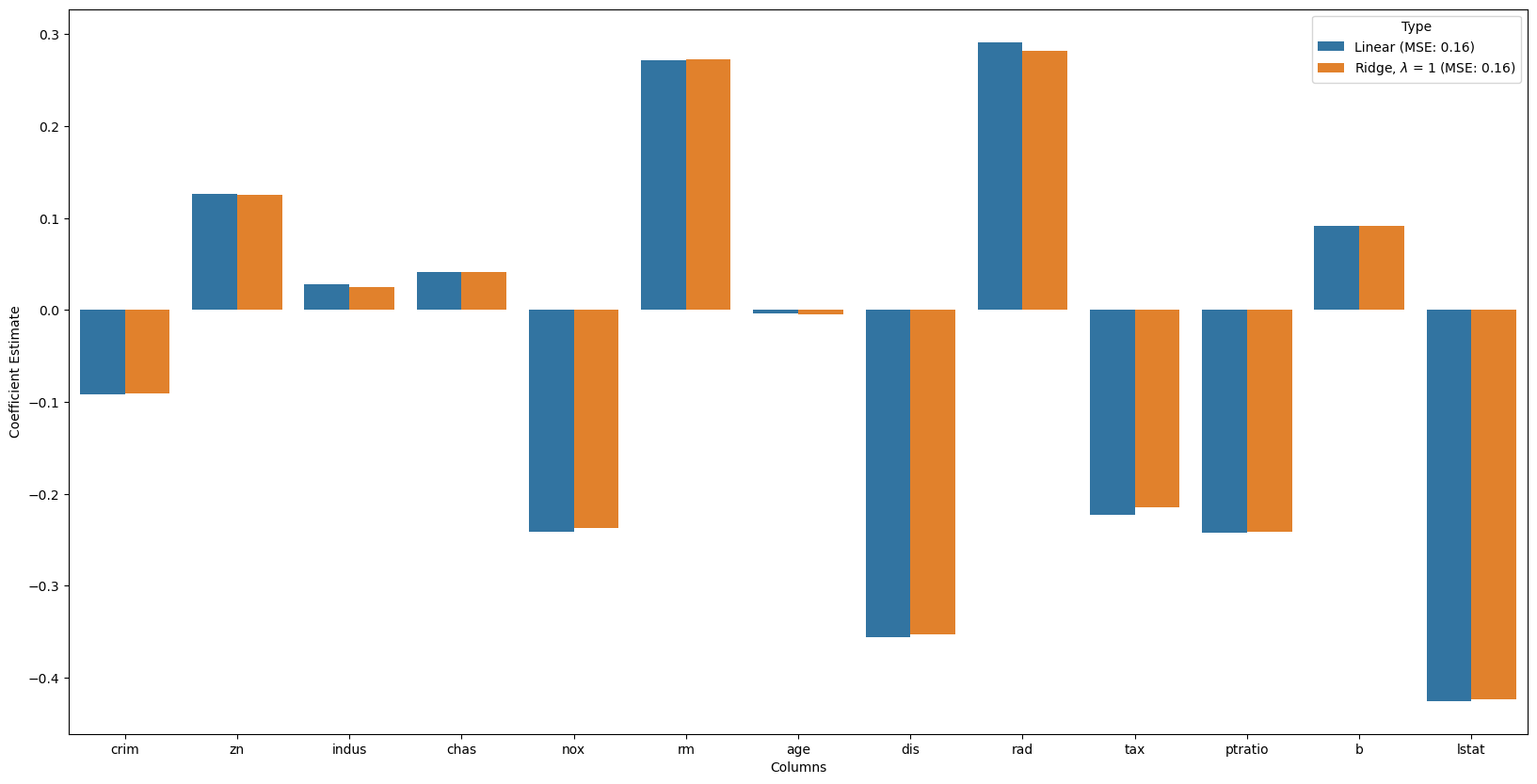 ridge_coefficient['Type'] = r'Ridge, $\lambda$ = '+ f'{alpha} (MSE: {str(np.around(mean_squared_error,2))})'Mean squared Error on test set : 0.16328472190858787
